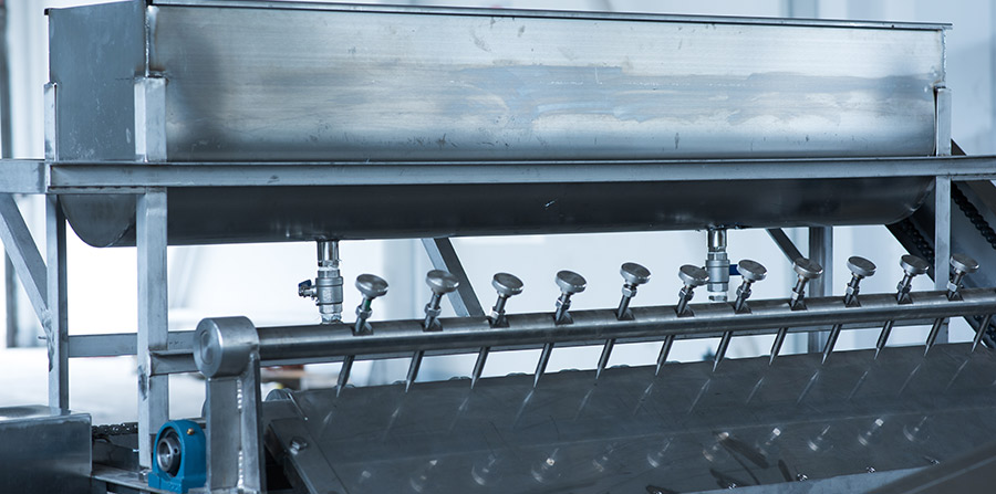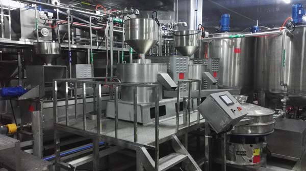 本生產(chǎn)線的調(diào)漿罐裝有攪拌裝置,在定量粉體喂料機(jī)的配合下將米漿調(diào)整到合適的狀態(tài),并防止米漿沉淀。本機(jī)的儲(chǔ)漿罐配有液位計(jì)和攪拌裝置,保證漿液不發(fā)生沉淀,布漿均勻。